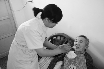 黄静在老年公寓中为不能自理的老人喂饭(资料片)。