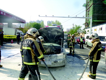 本报5月6日讯(记者 周衍鹏) 6日上午,一辆黑色轿车在新业广场附近等信号时自燃,路口执勤交警发现后,不顾个人安危,手持灭火器奋勇上前扑救,用光六七个灭火器后终于等到消防车增援,将火彻底扑灭。 6日早8点25分,市北交警大队辽源路中队副中队长李涌正在辽阳西路百安居门前疏导交通,突然对讲机中传来民警报告称,绍兴路南向北距辽阳西路路口20米,距振华加油站10米处,一辆黑色轿车发生自燃。于是李涌立即拿起车上的灭火器跑来灭火,同时通知其他民警向过往的大客车借灭火器帮忙。 “当时火苗呼呼地从发动机盖和已被烧化的右前大灯处往外蹿,小型灭火器根本不管用,我又跑到加油站借了个大型的灭火器。”李涌回忆称,在他和另外两名民警,以及加油站员工和车主的联手扑救下,火势一直被控制着没有继续蔓延。直到他们用光六七个灭火器后,两部消防车也及时赶到,消防战士戴着手套,将发动机盖打开,然后对着冒烟的机仓内不断喷水,很快自燃车辆的火焰被彻底扑灭。随后,李涌等人又和消防战士一起,将事故车辆推移到辽阳西路靠边停放,避免影响其他车辆通行。在民警的及时疏导下,交通秩序很快恢复。 “真的非常感谢交警同志帮忙,否则后果不堪设想。”据车主董先生回忆,当时他将车停在路上等信号,车辆自动熄火,结果等绿灯亮后启动车辆时,发动机仓部位突然开始冒烟,没多久就冒出了明火。 交警也提醒广大车主,夏季即将来临,驾驶人在车辆检修时,要注意检查油、气、电路是否有漏点,上车前,注意检查接头有无油迹。此外,行驶过程中也应注意有无“三异”(异响、异味、异象)现象,一旦发现异常,应及时送修,以免发生意外。