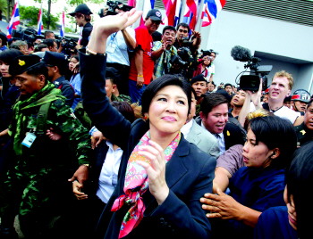 | 5月7日,在泰国首都曼谷,泰国看守总理英拉向支持者挥手致意。 新华/美联