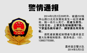 本报济宁5月7日讯(记者 孟杰 通讯员 孟祥平) 一场车祸中,七旬老人被车辆撞击后拖行30米,当场身亡。肇事司机立刻报警,积极配合调查并愿意对死者家属进行赔偿,却一直无人来认尸。老人已经死亡5天了,嘉祥县民警多方调查走访仍未发现任何线索。 5月2日晚上8点多,嘉祥市民王某下班后,开车带着同事赶往另一位同事家中吃饭,行至252省道仲山路口处时,被对面车辆的远光灯晃了一下眼睛。“当时只隐约看到前方不到一米的地方好像有个东西,没来得及刹车就轧了过去。”王某说,当车辆又行驶了30多米才停下,下车往回一看,车辆驶过的路面上有一滩血迹和一双鞋。 惊慌的王某和车上其他同事赶紧下车,在轿车底部发现有一个人挂在了底盘上不能动弹。“当时我们就拨打了120并报了警。”王某说,在围观行人的帮助下,医生将尸体从车底拽出,当场确认已经死亡。 “现场没有发现任何与死者身份有关的线索,只能确定死者是一位70岁左右,牙齿已经脱落的男性。”嘉祥县公安局交警大队事故处理中队的民警李嘉说,事发后,办案民警在周边村庄进行过走访,但依旧没有获得与死者身份有关的信息,也没有接到任何有关家人失踪的线索。 “目击者称老人当时是躺在马路上的,根据穿着,我们推测他可能是一位走失老人。”民警李嘉说,他们已经印发了认尸启示并在电视台做了游动字幕,但事故已经发生5天了,仍没有获得与尸体身份有关的有效信息。“目前肇事司机王某已被刑事拘留,其家人也做好了协商赔偿的准备,如果有人认识这位老人,请积极与我们联系。”