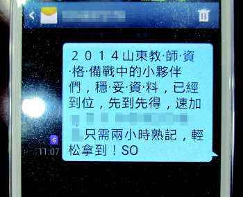 | 诈骗团伙向受害人发出短信,谎称可以提供教师资格证试题答案。 本报记者 刘光斌 摄 |