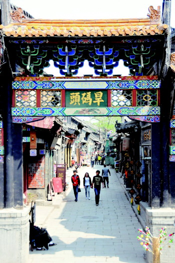 | ▲从丝市街沿街的众多老店面上依然能窥探到当年丝织业的繁华。 |  | ▲大街南门立着旱码头的牌坊。 |  | ▲魁星阁。 |  | ▲周村大街上有很多特色小吃老店面。 |  | ▲周村古商城的建筑风格与山西平遥古城有些许相似。 |  | ▲周村大街上还保留有民国时期的人力黄包车。 |