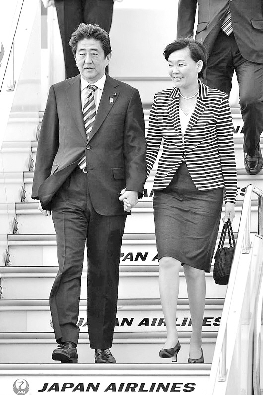 | 东京时间8日18时,羽田机场,日本首相安倍晋三与夫人携手走下舷梯。 |