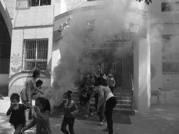 市青少年宫幼儿园小朋友进行火灾应急逃生演练。 本报记者 刘光斌 摄