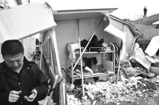 | 事故中受损的一间职工简易板房内,只剩一个上下铺没有被砸倒。 新华社发 |  | 黄岛挡土墙倒塌事故救援现场。