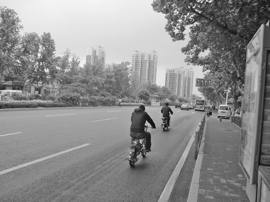 | 济南张庄路拓宽后自行车道变窄,不少市民在快车道上骑行。 本报记者 蒋龙龙 摄 |