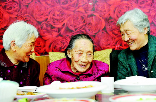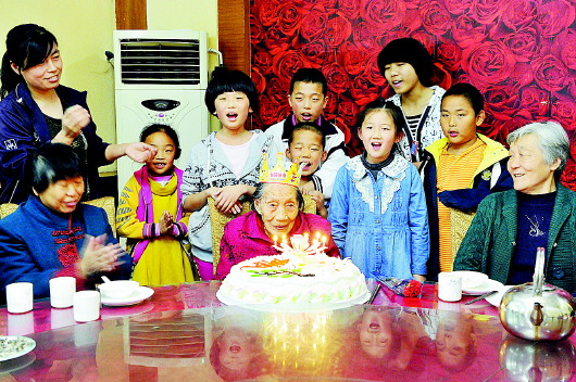 “祝你生日快乐,祝你生日快乐……”11日中午,在济南平阴县一家酒店内,伴随着欢快的生日歌,翟化英在孩子们的簇拥下吹灭了生日蜡烛,迎来了自己102岁(虚岁)的生日。当日也是母亲节,翟化英的子孙们纷纷从各地赶来,为老人庆生、过节。 翟化英1913年出生于平阴县安城镇东土寨村,丈夫英年早逝,那时三个儿子还小,都不懂事。好强又能干的翟化英扛起了整个家。今年76岁的二儿子朱士海回忆道:“那时家里种着十几亩地,母亲忙不过来就雇人帮忙。农闲的时候就织布纺线、做棉衣和鞋子拿去卖,挣些零花钱。她一个人照顾我们这一大家子,家里的大事小事都得操心,非常辛苦。” 朱士海说,一直到现在,母亲依然爱操心,客厅里的灯亮着,她就嘱咐儿孙们别忘了关;小孙子穿少了,她就一遍遍念叨多穿点。 翟化英的生活很规律,每天早上六七点起床,除了一日三餐,坚持上午一碗鸡蛋茶、下午一包牛奶。如今102岁的高龄,老人还是一头乌黑的头发。 生日当天,五世同堂,60多人全聚首为她庆生,其中不乏70多岁的老太太,全是满头的银发。年长二三十岁的翟化英却有着一头乌发。翟化英在二儿子朱士海家生活了51年,朱士海说:“我跟老伴的头发都白了,可母亲的头发几十年了就没变过。” 热热闹闹的生日宴马上结束了,大家伙刚要离席,翟化英手一挥,“把这些没吃完的菜都打包,太浪费啦!”众人大笑,老人爱操心的“毛病”又来了。