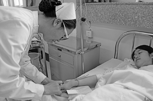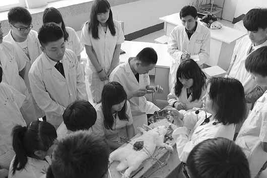 文/片 本报记者 白雪 解剖课上,女孩噙着泪水听课 9日,在泰山护理职业学院的实践课上,学习护理专业的2012级学生第一次解剖兔子。看着嗷嗷叫的兔子被固定在夹板上,几个女生忍不住跑出教室待了好长一会儿,直到把兔子麻醉剖开腹部后,她们才开始向教室中间挪动,听老师讲课时,一名吓得脸发白手直抖的女生,站在一旁一直抿着嘴,眼里噙着泪。 在教室后排,一名女生坐着发呆一动不动,她说:“我就是害怕嘛。”无论老师怎么让她上前听讲,她都无法鼓足勇气,始终都背过身去。 他们都是刚刚接触解剖的学生,今年即将实习的2012级高护专业学生温馨说,“她刚开始上课的时候心里也害怕,但在学校学习了两年后,心理承受能力增强了很多,当时解剖蟾蜍看心脏跳动时,她连碰都没敢碰。” 一位护理专业的女生说,这是她们第一次解剖兔子,兔子是很可爱的动物,她们哭是因为心里很不忍,看着它挣扎心里很难受。“但是,必须还得逼着自己去学习这些课程。” 学习注射,轮到谁就给谁打 学习注射是护理学专业学生的基本功,为了能尽快掌握方法,他们不能只对“假人”使劲儿,还得需要在老师的指导下,本班学生互相打针。 2011级护理1班单海无双说,他们班男生很少,几乎都是女生,但是打针也顾及不到男女性别,轮到谁就给谁打,大多注射维生素等药物,不会对身体造成危害。“我的血管粗比较好进针,有的女生血管细不好找,有时会扎疼,练习多的时候一天得挨三针,有的女生刚开始根本不敢给别人打针,得先过了心理关,慢慢地克服。”一名男生说。 学生温馨笑着说,她小时候很怕打针,现在已敢给别人打针了。“我们同学间都是互相打针的,第一次学打小针,一位同学没有用很大力打别人的屁股,结果缓缓地扎进去,同学被扎得哇哇大叫,本该用棉棒摁住针头拔出来,结果她一紧张又忘了,直接拔了出来,那同学好几天都屁股疼。” 学生李瑞说,在多次练习中,难免会有被别人扎痛了或者把别人扎痛的现象,直到快毕业乃至实习,才能逐渐掌握方法。
