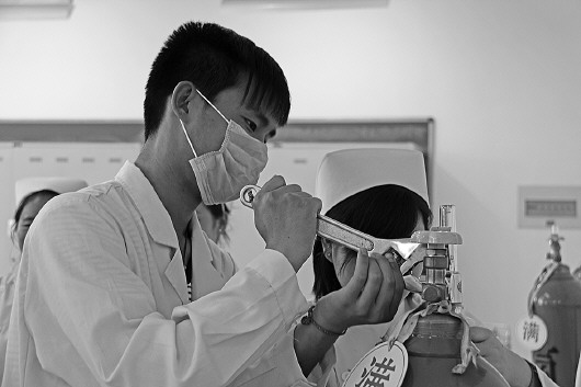 |  | 学习注射,同学们只能轮流当患者,大家相互打针练手艺。 |  | 有的女生根本没用过扳手,开氧气瓶只有请男生帮忙。 |