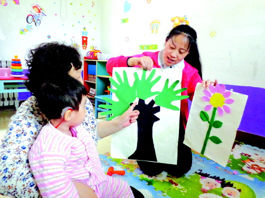 | 济南瑞峰听觉言语康复中心的特教老师毛阿云(右一)在教孩子识别“花”和“树”。 记者 孟燕 摄 |