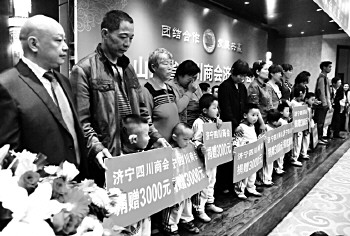 本报济宁5月11日讯(记者 岳茵茵) 9日,驻济异地商会又添新军,山东四川商会济宁分会暨济宁四川商会成立。济宁桃花山陵园管理有限公司董事长王鑫担任第一届会长。揭牌仪式上,济宁四川商会为10名残疾儿童捐款。 揭牌仪式上,四川商会拿出3万元捐给了10个残疾儿童,家长陪同孩子接收了爱心捐款。 据介绍,在济宁的四川人有近5万人。其中,在济宁创业的约有1万人,分布在济宁各个县市区。涉及科技、传媒等各个行业,很多企业耳熟能详。目前,四川省商会的会员近百人,他们都是在济宁的川渝商人。