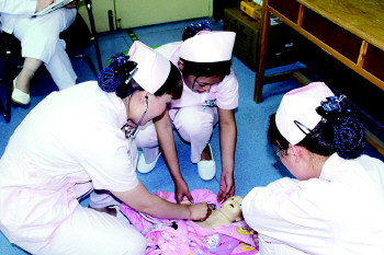 | ▲比赛现场,儿科护士用情景剧的方式普及育儿护儿知识。 |  | ◤现场还进行了新生儿抢救演练。 |
