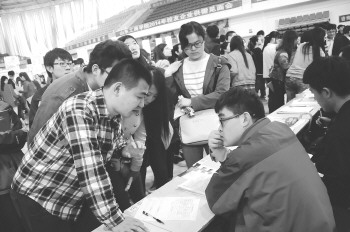 | 很多同学都来校友招聘会现场应聘。 本报记者 李泊静 摄 |