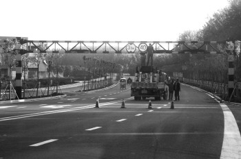 11日,减河滨河东路上,施工人员正在安装限高标识。据了解,两河四岸新修滨河大道的部分完工路段已开始放开通行。 本报记者 马志勇 摄