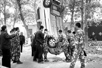 8日9时10分许,一辆白色小轿车撞到路边树木,翻倒在武警菏泽支队巨野县中队营区大门外,武警官兵迅速展开救援。