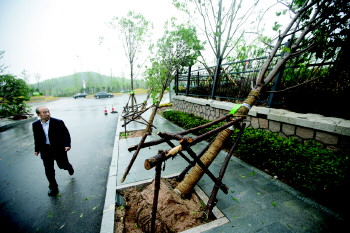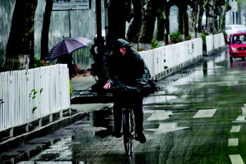| 11日上午,滨海大道两侧的行道树被大风吹倒。本报记者 张晓鹏 摄 |  | 11日上午,在辽宁路上,一名男子在雨中骑行。