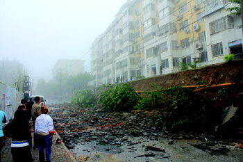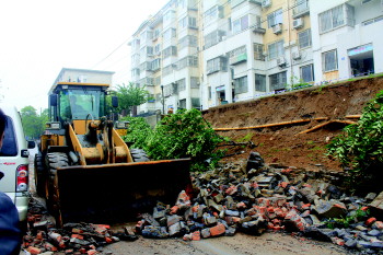 本报5月11日讯(记者 吕璐) “轰”的一声,一排长30多米高3米多的围墙轰然倒塌。11日9点50分左右,市北区都昌路和吉安路交界附近的北岭山花园小区西北方向的围墙被暴雨冲垮,吉安路上两辆面包轻微受损,所幸没有人受伤。 11日上午11点,记者赶到现场,北岭山花园小区西北边的吉安路上散落着一地的砖头和铁栅栏的碎片,四五棵樱花树倒在地上,还有几根路灯杆歪斜在路边。记者看到,北岭山花园小区依山而建,小区居民楼高于路面两米多。小区依照地势用围墙将居民楼包围,并设护栏遮挡。这次倒塌的墙体长约30米,高3米多。倒塌后,原本的位置只剩下黄土,里边包裹着的供热管道、电线等裸露出来。 事发时周边居民戴先生正好经过,他告诉记者,9点50分左右,他忽然听到背后“轰”的一声,只见路旁的高墙连同路边的路灯、树木全都倒了下来,连绵30多米。此时正好有一辆面包车经过,车身被飞溅的砖块砸到。戴先生说,面包车车主似乎有点受惊,不过车身受损小,人也没有受伤。后来车主联系了保险公司,将车开走了。而吉安路一家工地停在路边的面包车也被砸到,轻微受损。 “小区是2003年建成的,2004年入住。”北岭山花园居民张女士说,她家住的楼紧挨倒塌的围墙。这处围墙两个月前已经出现裂缝,还会渗水,平时经过担心有危险都绕道行走。事发时她正在家里休息,听到巨响后,透过窗户一看,外面已经一片狼藉。 大约12点左右,一辆大铲车来到现场清理路面。海伦路街道海南路社区的工作人员告诉记者,围墙倒塌的地方一直是早市的位置,每天有几百家小商贩来这卖蔬菜、水果、粮食等。日前,他们在安全隐患排查时,发现墙体裂缝,当时在墙上写着“墙体危险,请绕行”等提醒字样,并联系开发商修补。11日9点30分左右,怕墙体出现危险,社区的工作人员还来此巡逻,由于下雨,并未有小贩出摊。谁知9点50分左右墙就倒了,幸运的是没有人员伤亡。随后,他们第一时间联系了上级主管部门和清路车辆。 负责管理北岭山花园小区的青岛恒福物业的工作人员介绍,因为现场比较危险,他们已挨家挨户通知居民注意安全,并将派保安24小时在现场设岗。海伦路街道工作人员称,他们将尽快联系开发商对墙体进行维修,排除隐患。
