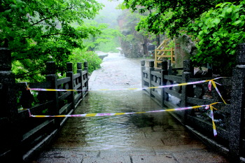 10日晚的一场大雨,让北九水雨量充沛。由于降雨量较大,11日,景区多处滚水桥被水淹没,竹林苑等景点由于雨水较大,已暂时封闭,不对游客开放。