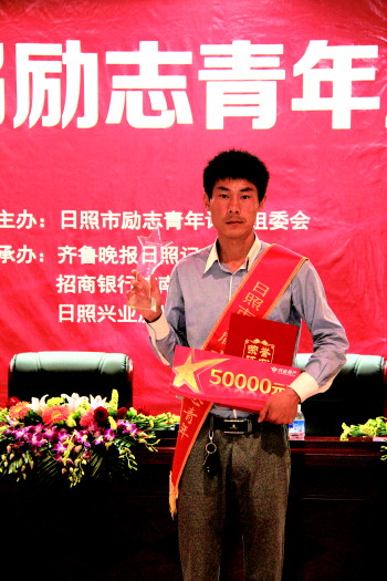 获奖感言:非常高兴能有这么一个展示自己的机会,认识这么多励志青年。我从他们身上学到了一种刚韧劲。虽然我的出生环境并不是很好,但我相信,凭着自己的努力,用自己双手一样可以得到自己想要的生活。很多时候不是我们做不成,而是我们不敢去想。