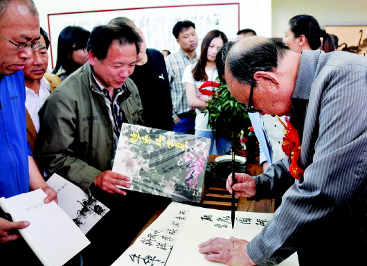 | 开展仪式简单而热烈。 本报见习记者 于雪莹 摄 |  | 赵紫林现场为家乡父老题字留念。 本报见习记者 于雪莹 摄 |