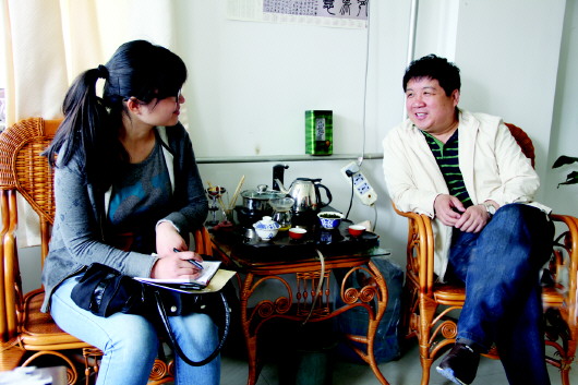 4月27日,由北京水墨公益基金会主办,《中国书画》杂志社、宝续堂、泰丰汇协办,以中国书法家协会青少年工作委员会为学术指导的“山东省十大青年书法家作品展”在中国水墨艺术馆开幕。本次展览共展出十位提名者的精品力作50件,充分代表了山东青年书法队伍的创作水平和未来动向。入选本次展览的“山东省十大青年书法家”,其中就包括陈杰。记者日前对他进行了专访。 陈杰(右)正在接受本报记者采访。 本报记者 王晓霜 摄