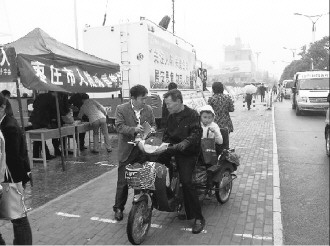 5月11日,枣庄市民政局在光明广场举办“防灾减灾日”科普知识宣传活动。据工作人员介绍,大部分市民的安全意识和灾害来临时的应变意识和能力比较差,需要多宣传来提升应变能力。图为当天,工作人员走上街头,向市民讲解安全知识。 本报记者 杨兵三 摄影报道