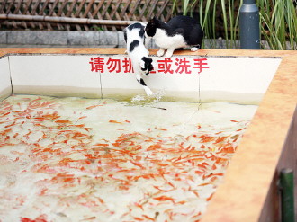 时间:2014年5月7日 自述:警示语写着“请勿抓鱼或洗手”,这只猫“熟视无睹”的作案。 点评:“眼疾手快定能抓到,喵。”