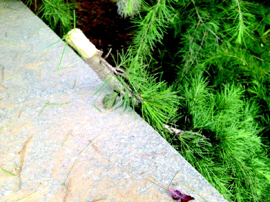 | 楼下的松树被坠楼男子砸断了很多树枝。
