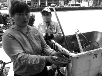 被打女环卫工的手套在拉扯中发生破损。本报记者 摄