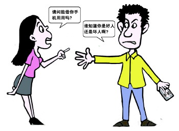 漫画:贺妍妍 我来抛砖 @laly111:周六朋友约好看电影,结果公交车上想问问朋友到了没,突然发现手机没电了。想跟车上的乘客借手机,结果,问了五六个人都以为我是骗子。 @小冰果:这个也不能赖别人的,你想想你自己会借给陌生人手机吗?现在都是人不可貌相啊! @那个:骗子太多,小心不为多余。防患未然,提高警惕,保卫自己。 @冰果丽儿:都是骗子惹的祸。 @飞云麦麦:现在的社会就是这个样子,人人自危!说实话,遇到这种情况,我想借,但我不敢。其实,实在逼急了,就找警察帮忙吧,没办法的办法了。 @我心乘风:换我就坚决借,就在你眼皮子底下人家打个电话,能怎么骗你啊? @117:周六一女士和我借电话,我正看孩子呢!愣一下,然后就借了。 @yd10xz:这个时代,其实并不是不想信任,而是不敢信任,现在的骗子手段令人难以想象,有个提防也是正常的!当然,并不是就没有好人了。