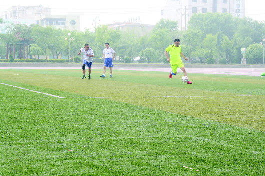 10日,无棣县第三届七人制足球赛在人民广场拉开帷幕。本次比赛共有八支球队展开角逐,比赛采用国际足联颁布的最新七人制足球比赛规则。图为11日,洲际足球俱乐部2队和海风足球队在雨中激战。