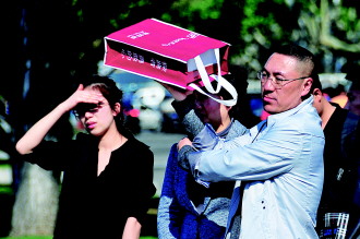 一场暴雨后,12日,市区天气晴朗、气温回升,最高温度23℃。在统一路和昆明交叉口,一市民举起手中的盒子为旁边的家人遮阳。