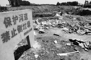 | 河道两旁虽有禁止倒垃圾的警示牌,但是依旧随处可见建筑垃圾。 本报记者 姜文洁 摄 |