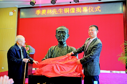 本报济南5月18日讯(见习记者 韩笑) 18日上午,由山东北京大学校友会捐赠的季羡林先生铜像在燕园内举行揭幕仪式,今后铜像将放置于北京大学图书馆外国语学院分馆门前,缅怀先生为北大和学术界做出的贡献。 山东北京大学校友会会长墨文川介绍,今年是季老驾鹤西去的第五年,为表达山东校友对季羡林先生的怀念与敬重之情,传承弘扬先生的风范,校友会向北大捐赠一尊季羡林先生铜像。 据了解,山东银丰投资集团有限公司董事长、山东北大校友会副会长王伟率先带头,慷慨捐资。山东艺术学院教授、山东省雕塑家协会主席刘大力担纲创作。书法大师、校友会名誉主席欧阳中石为雕塑题词。 “先生早年赴德留学,留学归来就在北大任教,为东方语言学术的发展贡献了毕生的精力,为国际文化的交流做出重要贡献,堪称学术界的一代宗师。山东校友会向北大捐赠了季先生的铜像,体现了大家对季老的仰慕,对母校的关心。”北京大学副校长王仰麟表示。 “我们最终决定将铜像放于北京大学图书馆外国语学院分馆门前,让先生与他至爱的书籍、热爱读书的学生们在一起。”外国语学院院长程朝翔说。 山东银丰投资集团有限公司董事长、山东北大校友会副会长王伟说:“作为民营企业的董事长,在经营企业的过程中,了解到传统文化的重要性,我作为毕业于北大光华管理学院的校友,认为捐赠铜像非常有意义,所以积极参与。” 上午11时,欧阳中石和王伟为铜像揭幕。“看到铜像,又让我想起先生生前的种种。”与季羡林一起工作过的老教师感慨道。大家纷纷在铜像前合影留念。