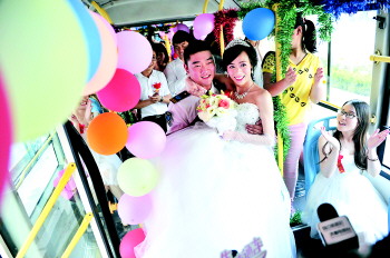 18日,在济南英雄山路上,一辆长约18米的巨型公交车装扮一新行驶在路上。当日,新郎马志岗高兴地开着平时驾驶的4路公交车迎娶了新娘宋财美。去年三月一场大雨中小宋忘记带伞,淋得浑身湿透后上了马志岗驾驶的公交车,下车时马志岗把伞借给了她,从此两人相识、相知到相恋,成就了这段公交姻缘。