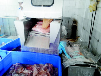 | 注水工艺已报备,旁边加注的料水呈粉红色,添加的色素未按规定报备。 本报见习记者 王皇 摄 |  | 腌肉包装箱未写任何厂家信息。 本报见习记者 王皇 摄 |