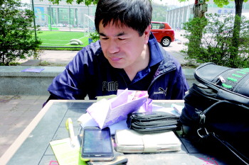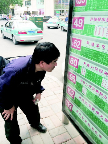 | 奔波几日无功而返,在全部求职材料与家当面前,邱胜显得疲惫不堪。 本报见习记者 王杰 摄 |  | 邱胜查看公交路线。