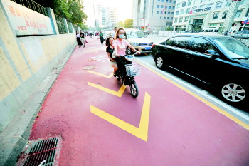 5月18日,经四路南侧4米多宽的黑色沥青非机动车道,已被彩色非机动车道所替代。机动车道与非机动车道之间设立了“隔离式”停车位。