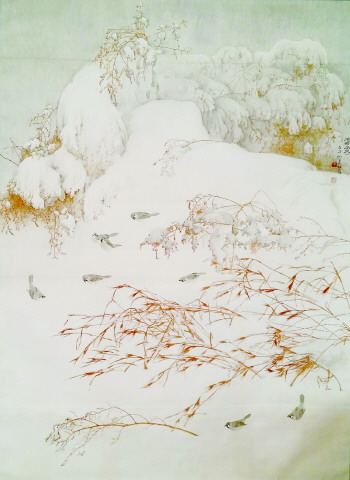 面对生机盎然的自然之竹,马麟春通过长期不懈的观察、体悟,掌握了竹子的特性,以及在风晴雨雪中的不同姿态,他尤其善画风雨、大雪之中的竹子。看马麟春笔下的风中之竹,仿若忽有一阵风过,竹叶被吹向画纸的一端,摇曳着、挥舞着,那种生机盎然之势随着风势而起,他认为,这种动感十足的风中之竹奋发着向上的力量,不畏艰难,彰显着一种正能量;而他笔下的雪竹则完全用墨色渲染出来,墨竹、白雪交相呼应,更显单纯之美。马麟春回忆说,画雪景源于1994年的一场大雪,当时和画家张丽华一起去到济南南部佛慧山的大佛头,雪后的山区完全变了模样,看着天地间一片白雪茫茫,心中异常兴奋,回去便画了第一张雪景画——《雪浴》(入选第八届全国美展并获奖),之后又陆续画了《雪野》、《雪霁》等一系列雪景画。在这些雪景工笔画中,马麟春将宋徽宗花鸟画中的工笔技巧融入作品,以“雪”为载体,完成了他在那个阶段的花鸟画探索。之后,马麟春进一步钻研写意花鸟,纯墨色写意雪竹、颜色绚丽的牡丹以及泼墨而成的荷叶都成为他的笔下之物,就如同他自己所追求的那样,画就画出自己的风格,画出自己的真情实感,不被已有的成就所禁锢,才能得艺术之精髓。 (刘莹莹)