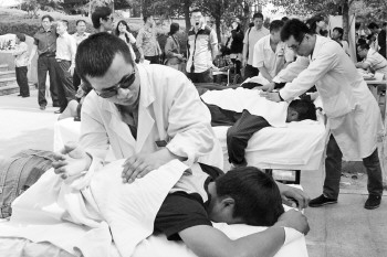 | 10多名盲人按摩师走上街头,免费为市民按摩。 本报记者 凌文秀 摄 |