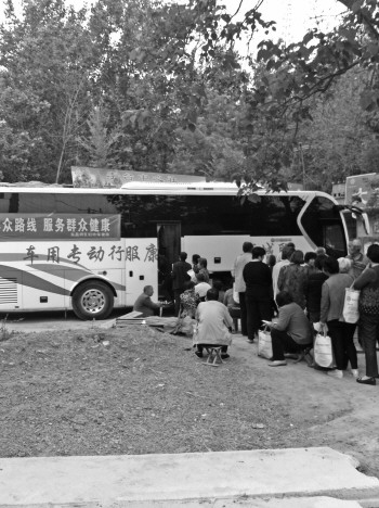 | 大型体检车免费为村民查体,村民排起了长队。 本报记者 王尚磊 摄 |