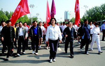 17日上午,德州市第十一届全民健身节开幕式在市体育中心广场举行,市委书记、市人大常委会主任吴翠云,市长杨宜新出席开幕式,并与数千名市民一同参加了健步行活动。 本报记者 王小会 摄