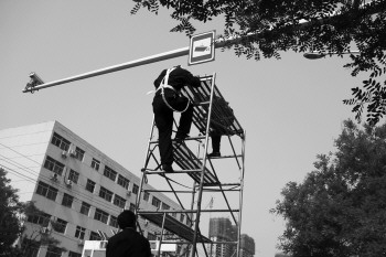 18日下午,东方红路上,工作人员正在安装监控设施提示牌。据了解,此次共安装500多个提示牌,涉及100多个路口,为市民提供出行便利。 本报记者 王小会 摄