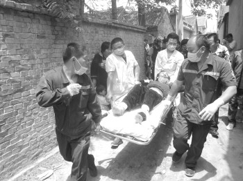 | 医护人员正将精神病患者送往救护车。记者 赵念东 摄 |