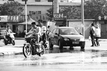 18日,市民王女士拨打本报热线电话反映青年路与大学路交叉口污水横流,臭气熏天。记者赶到现场看到,在路口东北侧有一大滩污水,气味难闻,不少市民掩鼻而过,一些车辆选择绕行,有的则直接轧水而过。