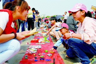 17日,枣庄市第三届公益文化节暨首届少儿文化节在光明广场举行。来自鑫昌路小学的上百名小学生,拿出自己的闲置物品进行义卖,并将义卖的钱进行捐赠。 本报记者 贾晓雪 摄影报道