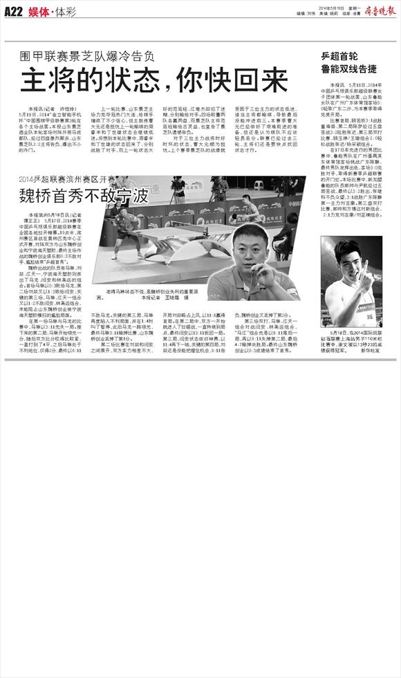 乒超首轮鲁能双线告捷
