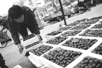 ▲烟台凉地大樱桃陆续上市,今年樱桃坐果率高,但价格降了。 本报记者 李泊静 摄