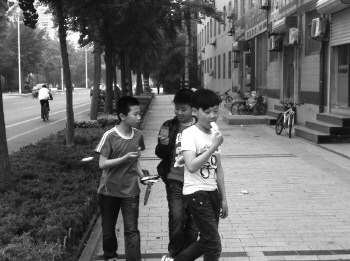 | 一些小学生从商店内购买零食后,结伴走在路上。 |  | 在一家小饭桌内,一些孩子正在吃午餐。 |