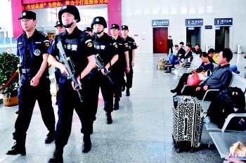 近日,聊城警方优化警力配置,加强对重点场所和密集人群的治安巡逻防范力度。在处置中,聊城警方将依据法律规定对于警告无效的可以使用武器。图为特警分队携枪在火车站大厅进行武装巡逻。